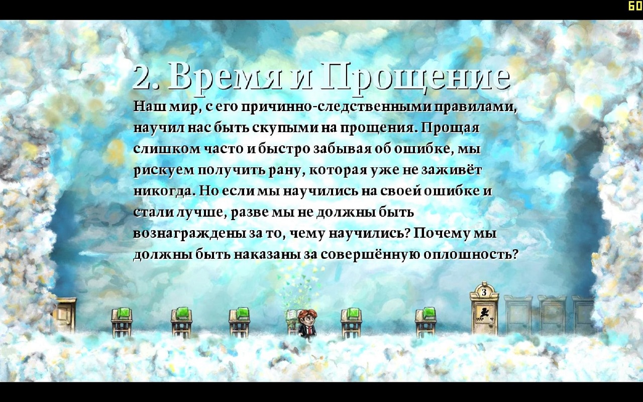 • Обручальное кольцо. Эта необычная вещь появляется на последнем этапе приключений Тима и имеет дополнительные способности по управлению временем. Чем ближе какой-нибудь объект находится к этому кольцу, тем медленнее он движется. Перемещая кольцо между объектами, можно одновременно менять режимы их скоростей. Очень полезная штука!
